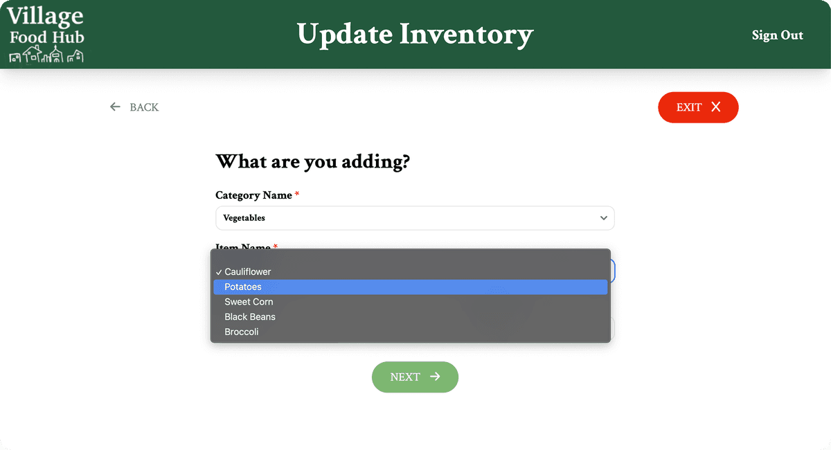 Currently, the pantry has no system to track its food inventory or to record information about the individuals who donate or receive food, which is key for grant applications. Our goal is to create a web application that keeps track of Village Food Hub’s overall pantry inventory and collects demographics of the food pantry customers.